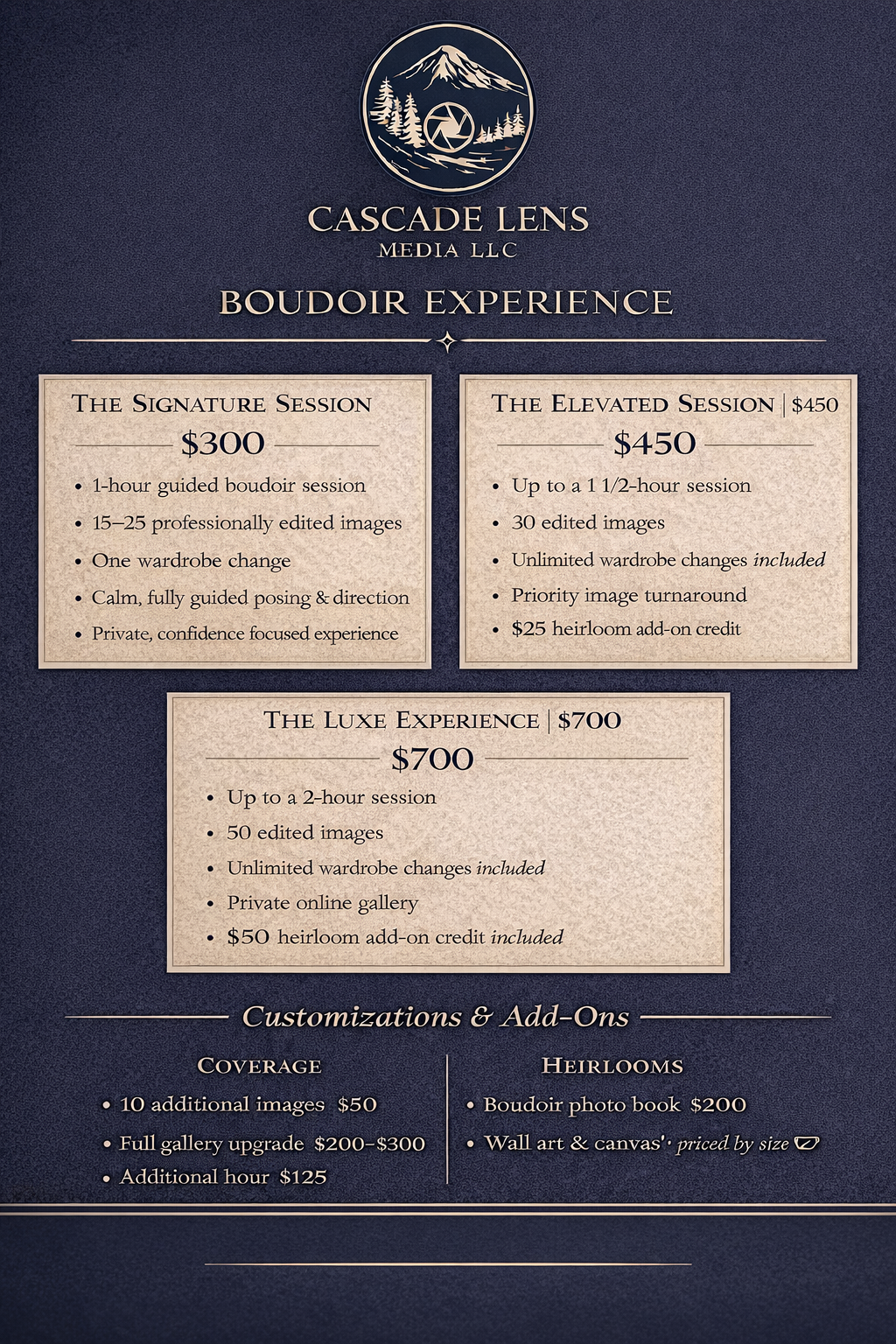 Together, we’ll select the perfect location—indoor, outdoor, or a combination—and choose a date that works best for you. I’ll help guide you based on lighting, privacy, and the overall feel you’re going for, so everything is set up for a relaxed experience.